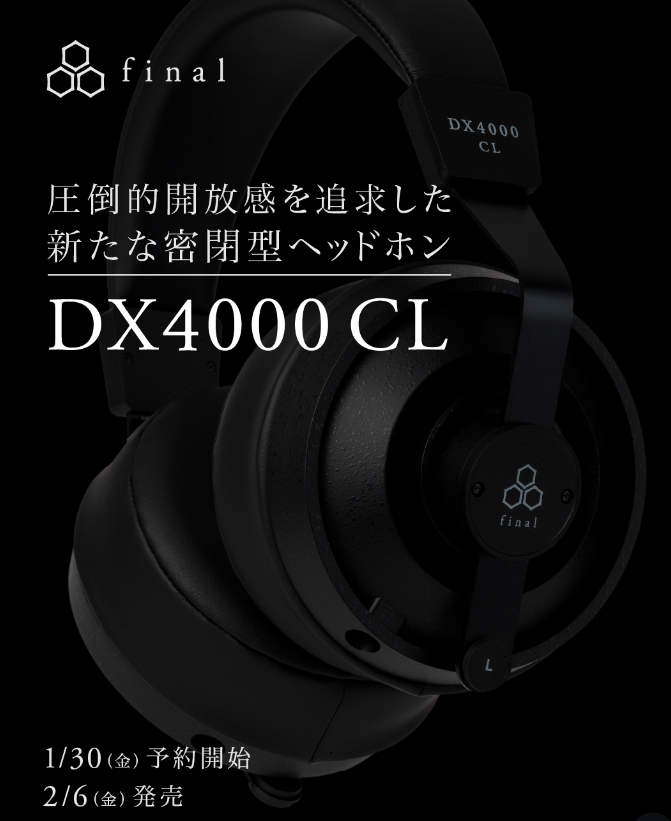 音響ブランドfinalは、新たな密閉型ヘッドホン「DX4000 CL」を発表し、2025年1月30日(金)より予約受付を開始する。一般発売は2月6日(金)を予定している。本製品は、密閉型でありながら開放的な音場表現を目指して開発されたモデルで、同社の技術思想を継承しつつ新たなリスニング体験を提案する。