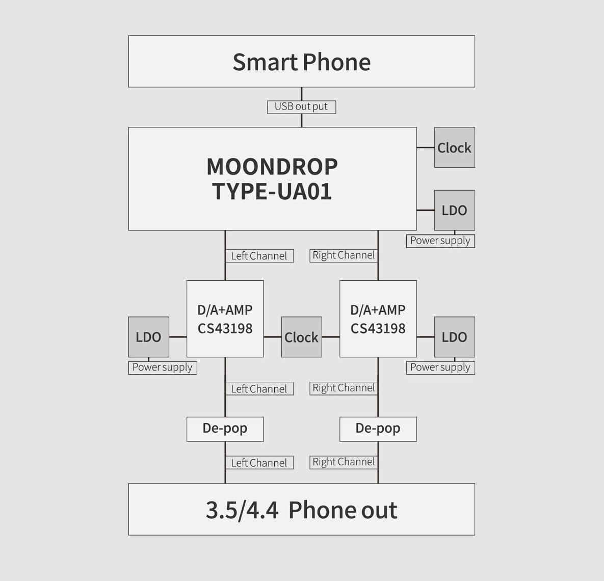 本機はCS43198をデュアル構成で採用するほか、3基の独立LDO電源チップと自社開発のカスタムオーディオメインコントロールチップ「MOONDROP TYPE-UA01」を組み合わせ、高品位な電源設計と安定した動作を実現している。