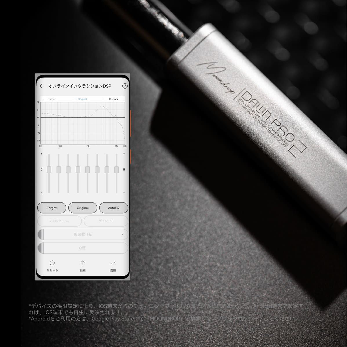 第2世代DSPを搭載し、公式アプリ「MOONDROP GLOBAL」(iOS)および「MOONDROP」(Android)からパラメトリックEQの設定が可能。フィルタータイプ、周波数、ゲイン、Q値を自由に調整でき、周波数特性データベースを基準としたチューニングにも対応する。