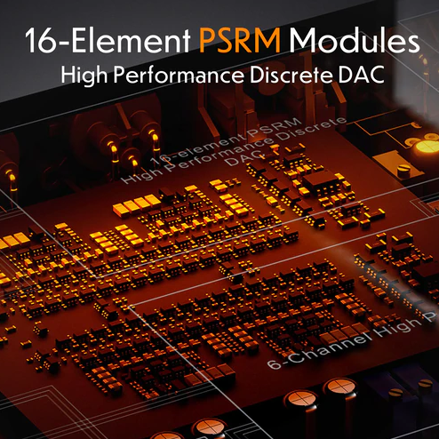 DX9 Discreteには、TOPPINGが新たに開発した「PSRMモジュール」を左右チャンネルそれぞれに搭載。各チャンネルは16フェーズ構成となっており、高速スイッチングロジックICと高精度電圧リファレンス回路から成る1bitディスクリートDACアーキテクチャを採用している。